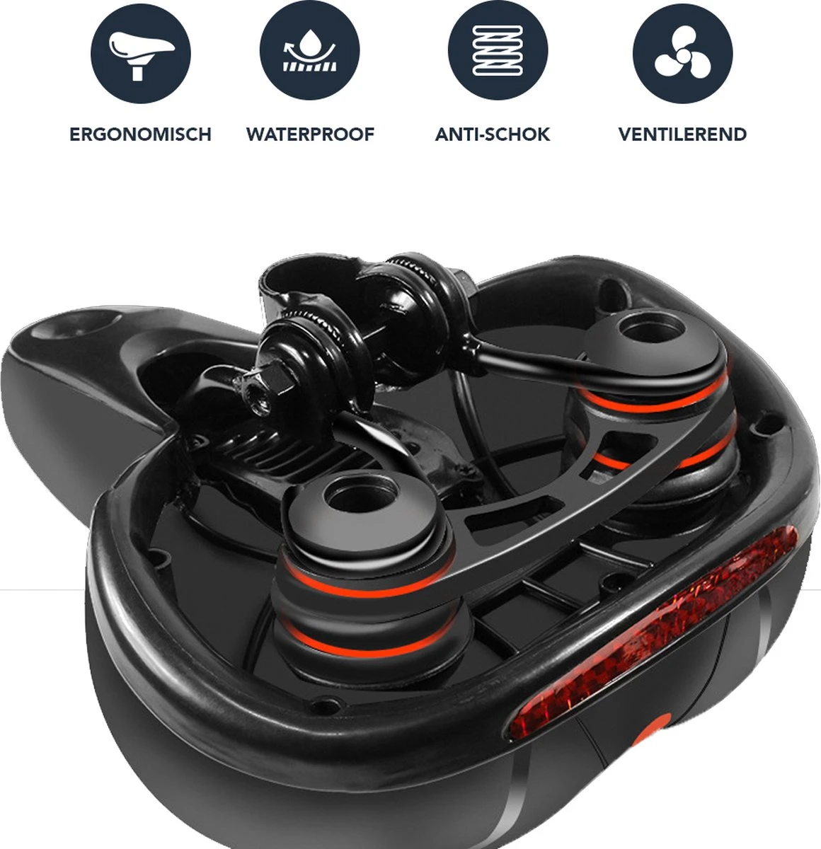 Dit stevige en toch zachte zadel is voorzien van alle gemakken om al je fietsritjes zo prettig mogelijk te maken. Het zadel is voorzien van een reflecterende strip, een schokabsorberend systeem, een luchtkanaal, is waterproof en antislip. Het veersysteem met twee rubberen schokabsorberende ballen aan de onderkant van het zadel zorgen ervoor dat je zelfs op hobbelig en lastig terrein met comfort kan fietsen. Daarnaast maakt het hoogwaardige PU-leer het zadel slijtvast en krasbestendig, zodat hij lekker lang meegaat.