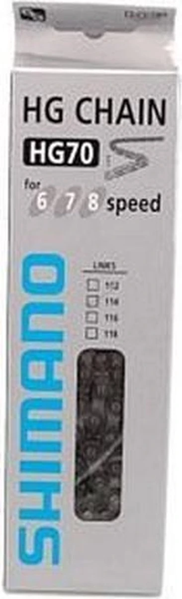 Productspecificaties Shimano groep: 2200 Merk: Shimano Modelnaam: CNHG40 Modeljaar: 2005 Aantal versnellingen: 8/7/6 Aantal schakels: 116 Soort artikel: Ketting