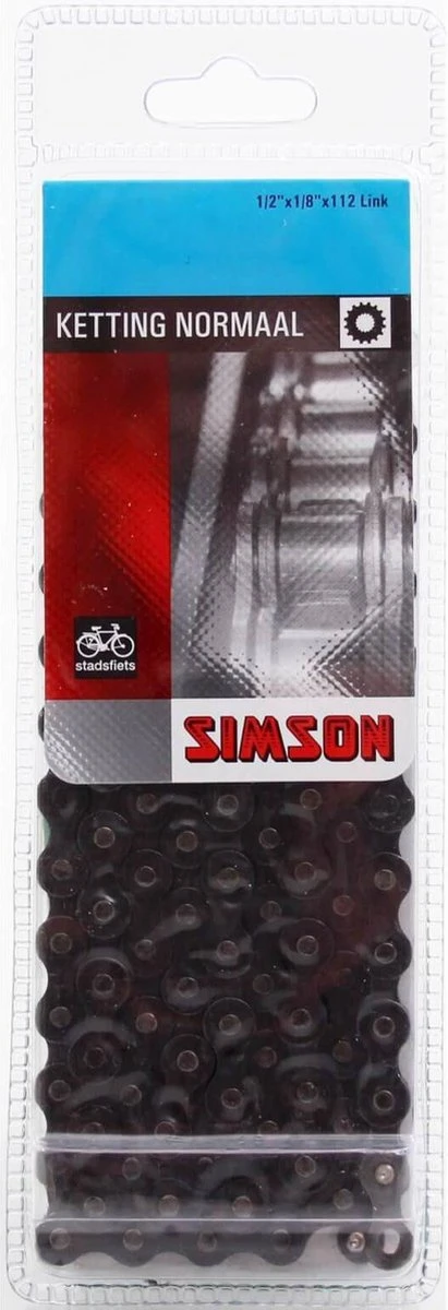 De Simson Ketting Normaal is een fietsketting geschikt voor stadsfietsen zonder versnelling en fietsen met een naafversnelling van SACHS of Sturmey Archer. Deze ketting heeft 112 schakels en een maat van 1/2 “x 1/8”. De ketting is op maat te maken met behulp van een Simson kettingpons. Leg de ketting over de tandwielen en sluit de uiteinden van de ketting aan elkaar door de bijgeleverde verbindingsschakel vast te klikken. Details: Singlespeed 1/2 “x1/8” 112 link