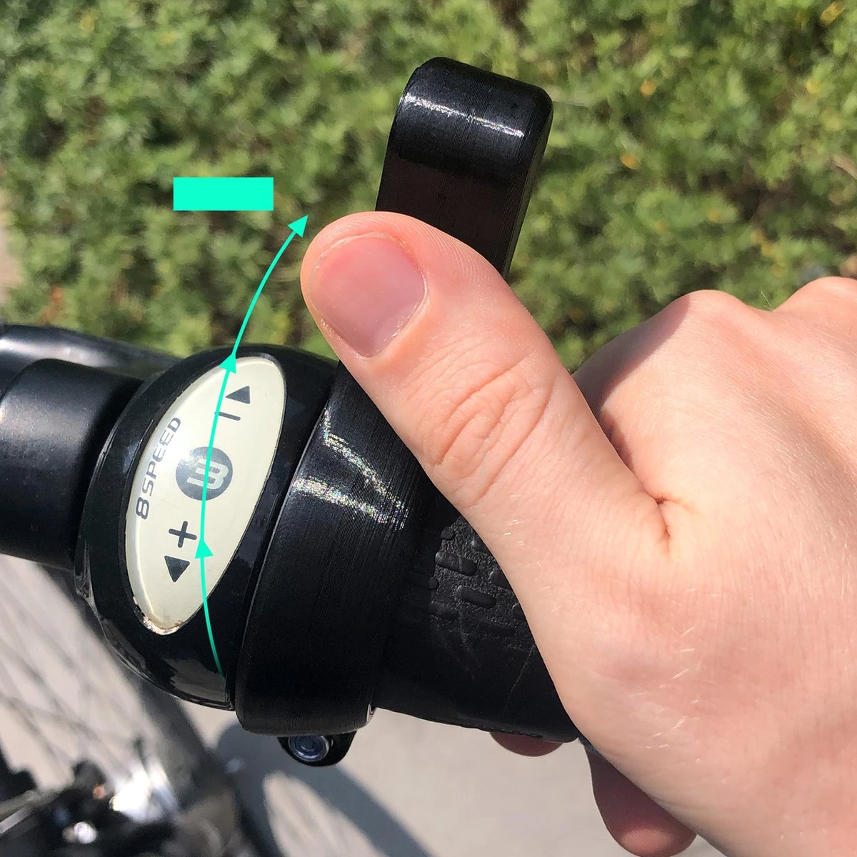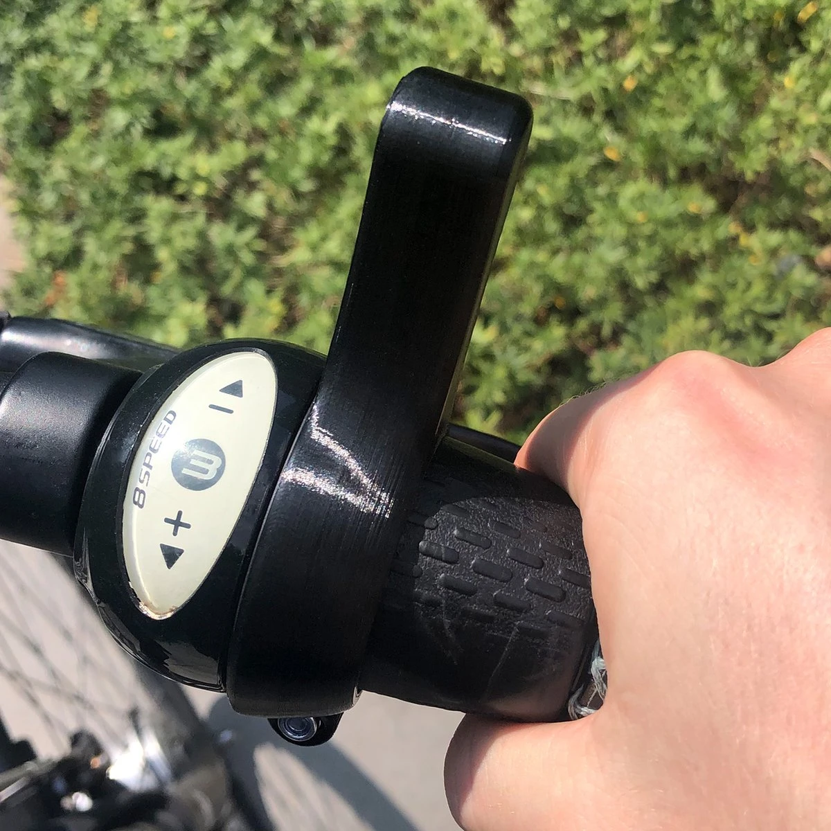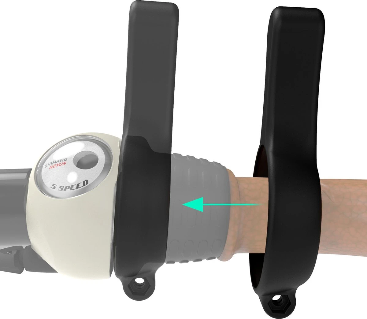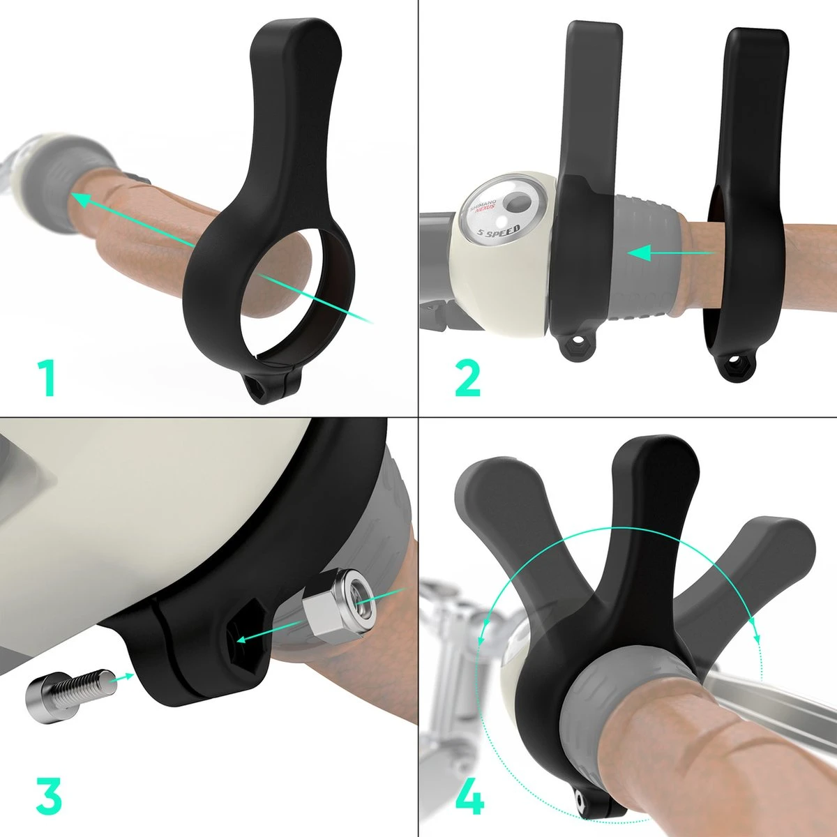 Het hulpmiddel is makkelijk te bevestigen met het bijgeleverde schroefje en moertje. Als eerst moet het hulpmiddel om de versnelling worden geplaatst. Plaats vervolgens het moertje en het schroefje in het hulpmiddel en draai vast totdat het hulpmiddel om de versnelling klemt.